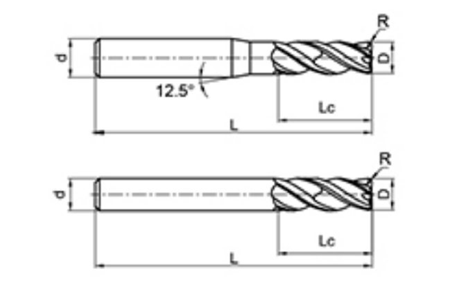 | Ne. | Průměr D | R Úhel R | Délka flétny Lc | Celková délka L | Shank Dia d | Počet čepelí F |