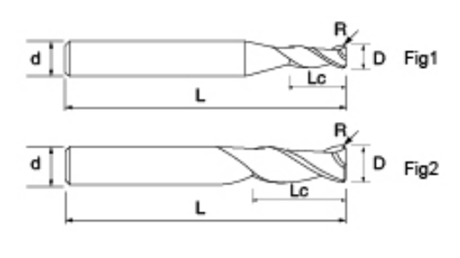 | Ne. | Průměr D | R Úhel R | Délka flétny Lc | Celková délka L | Shank Dia d | Počet čepelí F |