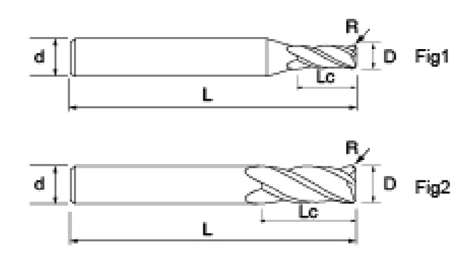 | Řada nástrojů | Průměr | Poloměr | Poloměr rohu | Délka flétny | Efektivní délka | Celková délka | Shank Dia | |||