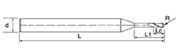 | Ne. | Průměr D | R Úhel R | Délka flétny Lc | Efektivní délka L1 | Celková délka L | Shank Dia d | Počet čepelí F |