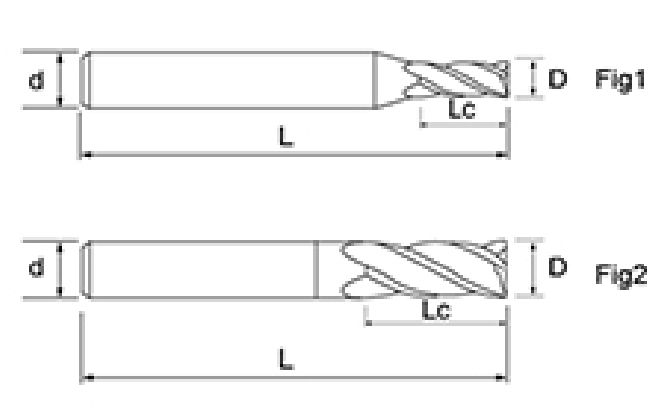 | Ne. | Průměr D | Délka flétny Lc | Celková délka L | Shank Dia d | Počet čepelí F |