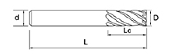 | Ne. | Průměr D | Délka flétny Lc | Efektivní délka L1 | Celková délka L | Shank Dia d | Počet čepelí F |