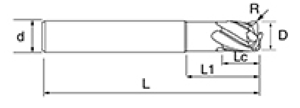 | Ne. | Průměr D | R Úhel R | Délka flétny Lc | Efektivní délka L1 | Celková délka L | Shank Dia d | Počet čepelí F |