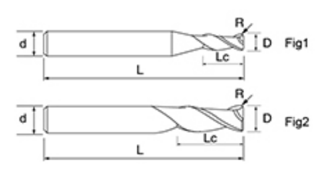 | Ne. | Průměr D | R Úhel R | Délka flétny Lc | Celková délka L | Shank Dia d | Počet čepelí F |