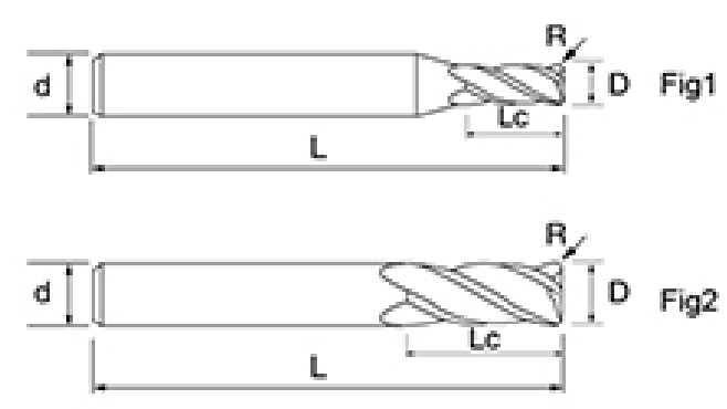 | Řada nástrojů | Průměr | Poloměr | Poloměr rohu | Délka flétny | Efektivní délka | Celková délka | Shank Dia | |||