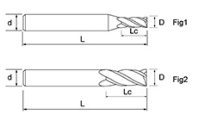 | Ne. | Průměr D | Délka flétny Lc | Celková délka L | Shank Dia d | Počet čepelí F |