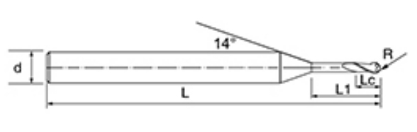 | Ne. | Průměr D | R Úhel R | Délka flétny Lc | Efektivní délka L1 | Celková délka L | Shank Dia d | Počet čepelí F |