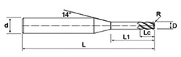 | Ne. | Průměr D | R Úhel R | Délka flétny Lc | Efektivní délka L1 | Celková délka L | Shank Dia d | Počet čepelí F |