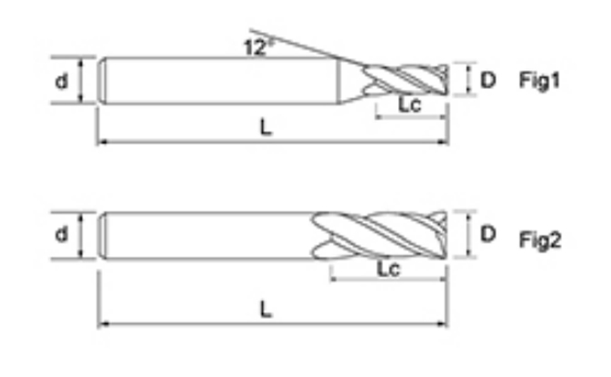 | Ne. | Průměr D | Délka flétny Lc | Celková délka L | Shank Dia d | Počet čepelí F |
