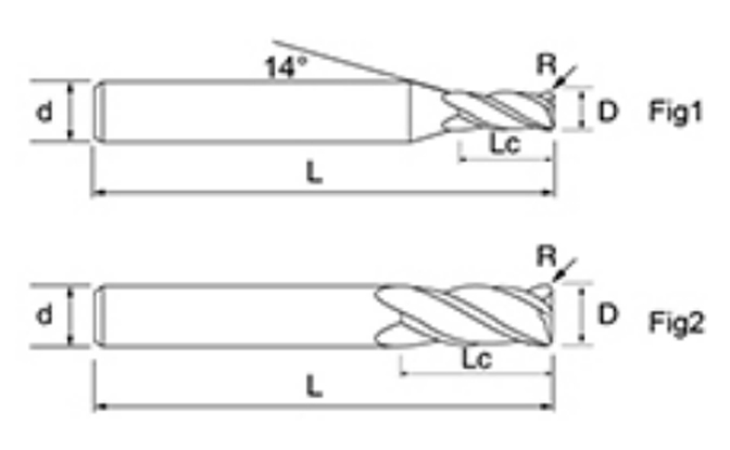 | Ne. | Průměr D | R Úhel R | Délka flétny Lc | Celková délka L | Shank Dia d | Počet čepelí F |