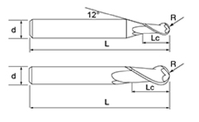 | Ne. | Průměr D | R Úhel R | Délka flétny Lc | Celková délka L | Shank Dia d | Počet čepelí F |