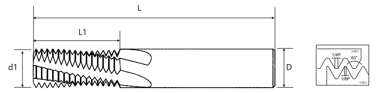 | Rozteč | Hrubé zuby UNC | Jemné zuby UNF | Ultra jemné zuby UNEF | Průměr čepele d1 | Efektivní délka čepele L1 | Průměr rukojeti D | Celková délka L | Počet čepelí | Průměr spodního otvoru |